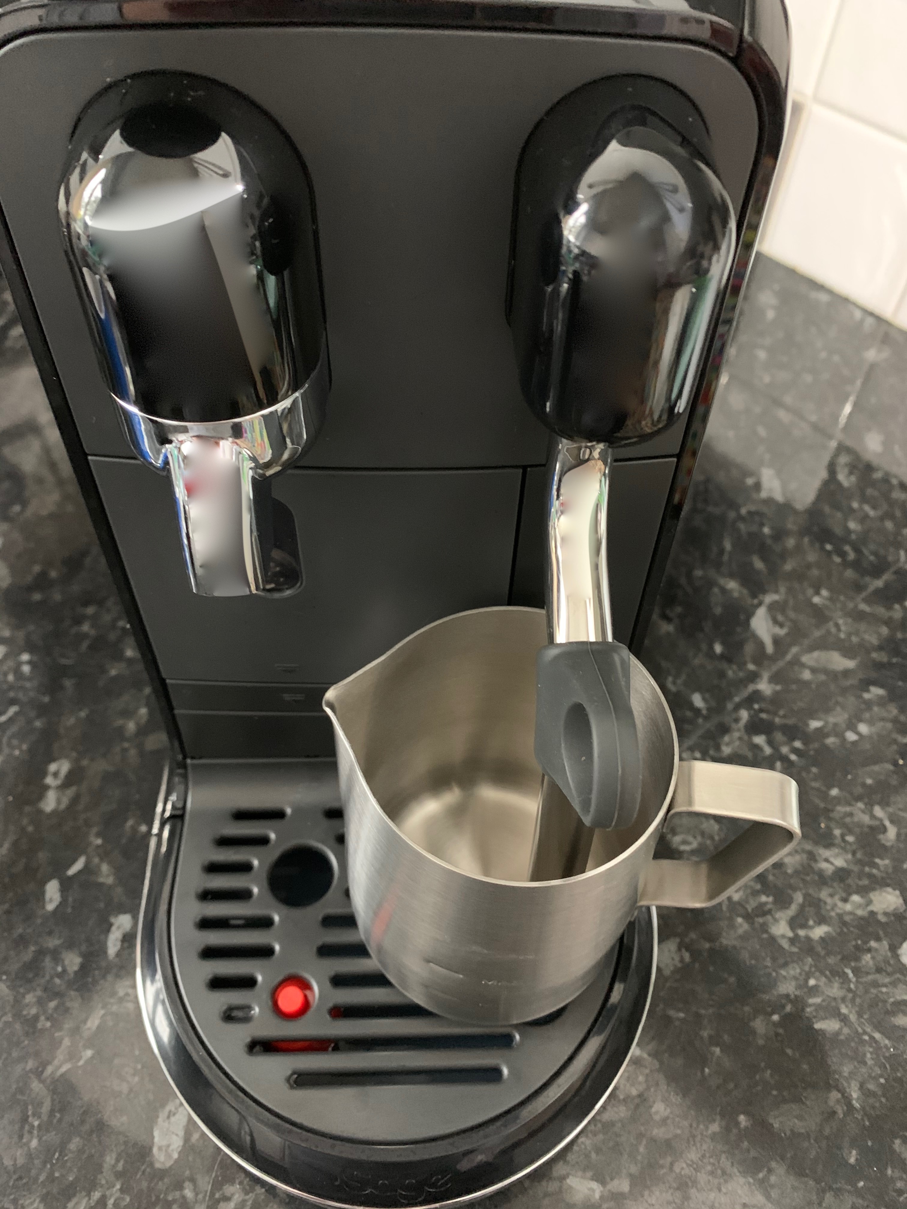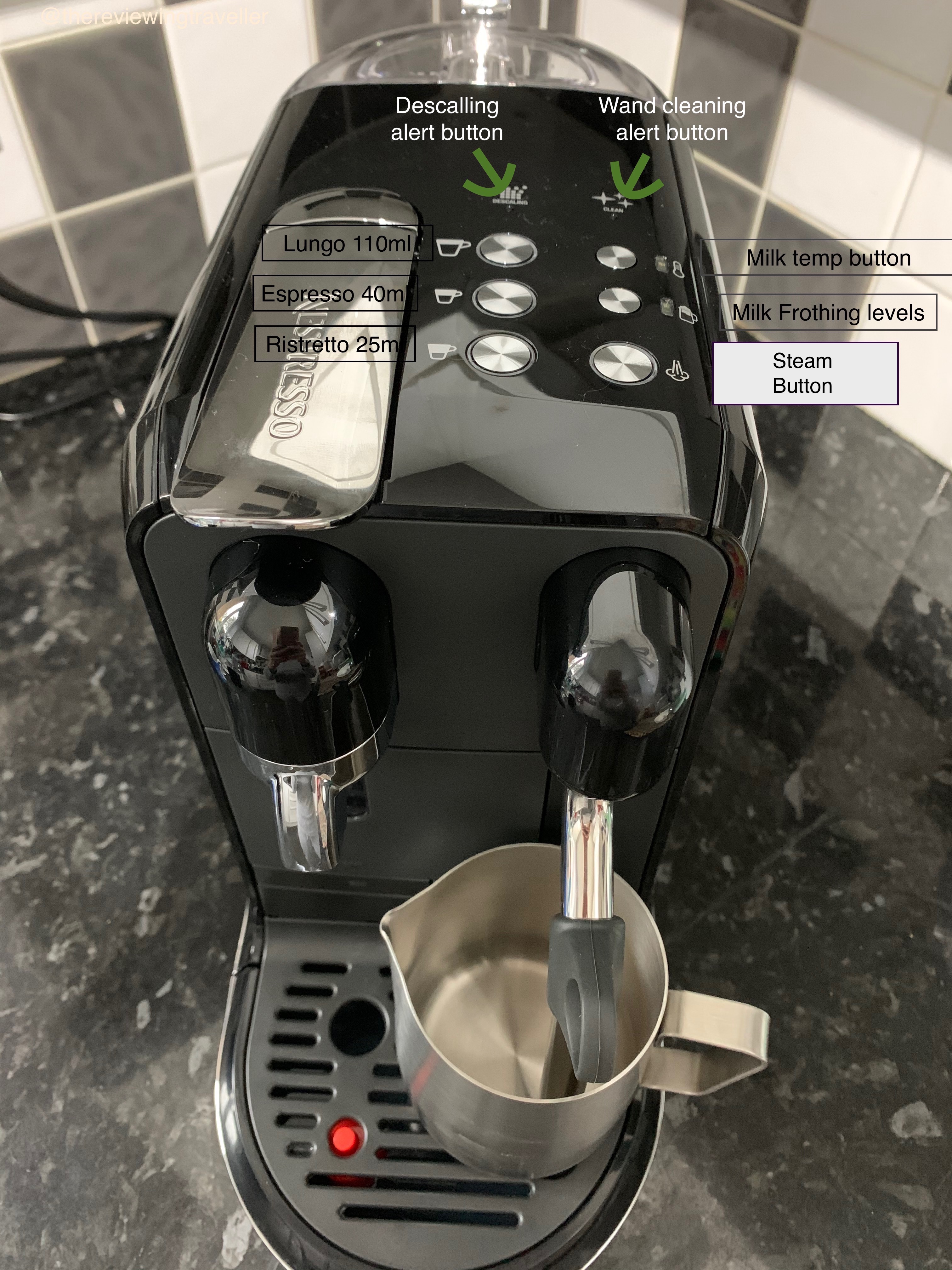 It is a good idea to purchase more capsules, water hardness strips and descaler sachets not long after you have purchased the Creatista. There are has two cleaning functions and when they need to be performed a light will show on top of the machine, it will stop functioning if you don’t complete the wand cleaning or descaling actions when the lights appear, so make sure you have descaling sachets always available. To clean the steam wand you have to remove the water tank and retrieve the plastic attachment that has a pin in it. Once you have removed the cap the pin is used to the prod the end of the wand to clear any built up milk. The best way to reduce the wand cleaning light come on is to clean the outside of the wand each time you use it. This gives a better tasting drink, is more hygienic and prevents the build up of milk in the wand. The wand does self steam after use, once the jug is removed and it is back in its original position. You will have seen baristas do this in any coffee shop and in my opinion I find that it is a lot easier to wipe the wand and wash out the jug each time. I have found the wand easier to clean than the aeroccino stand alone milk frother, which has a separate whisk inside that gets removed to clean. However, I have used a aeroccino for many years with no complaints, it’s just that the wand is less time consuming.